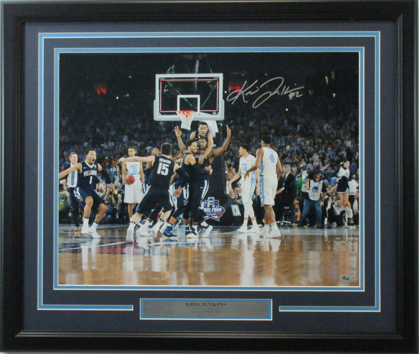 This photo is personally autographed by Villanova Wildcats National Champion Kris Jenkins. This photo shows the celebration after Jenkins game winning jump shot to win the 2016 NCAA Championship. This photo is professionally matted and framed and comes with a Sports Vault certificate of authenticity.