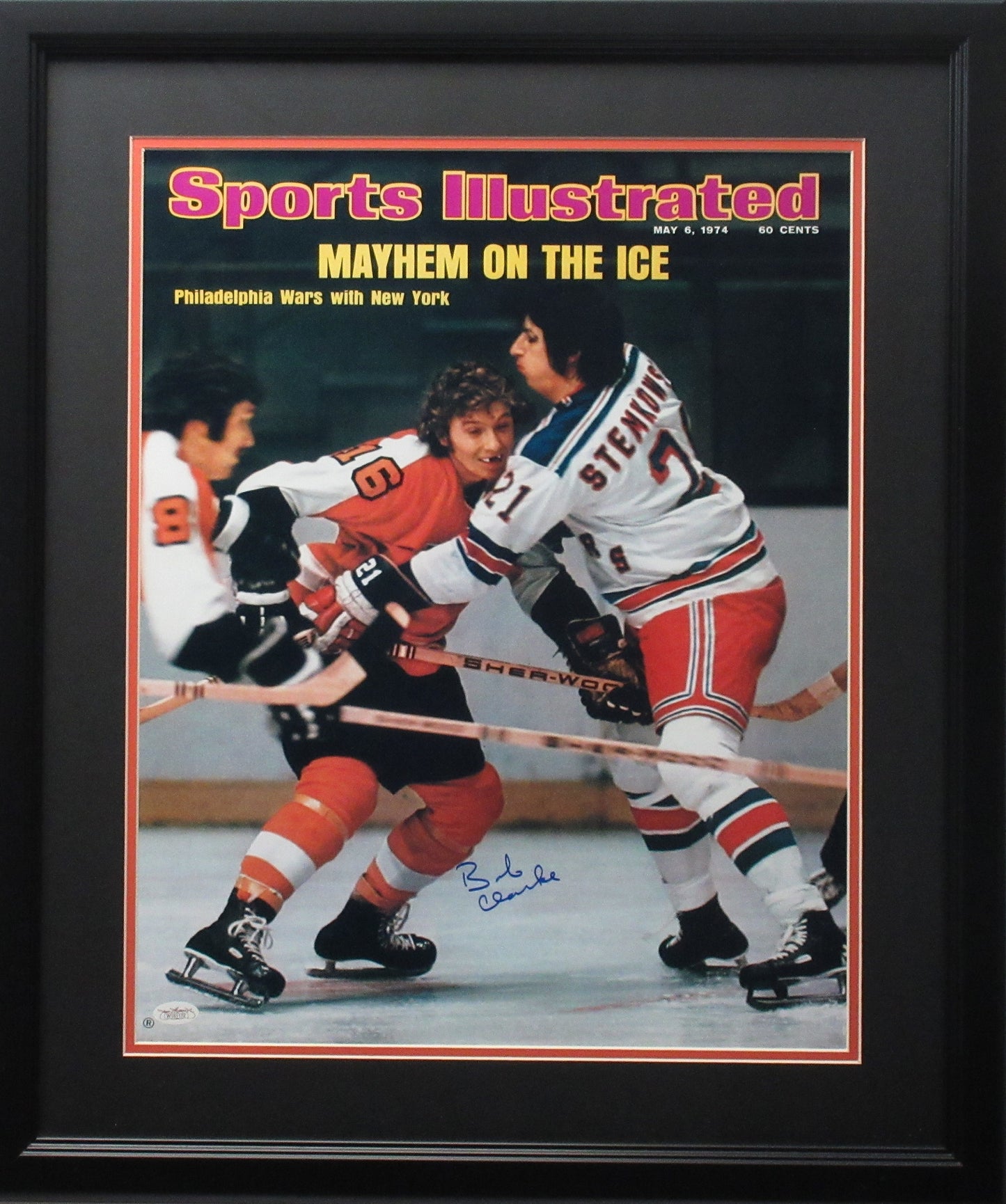 This 16x20 photo is personally autographed by Philadelphia Flyers Bobby Clarke. This photo is professionally matted and framed and comes with a Sports Vault certificate of authenticity.