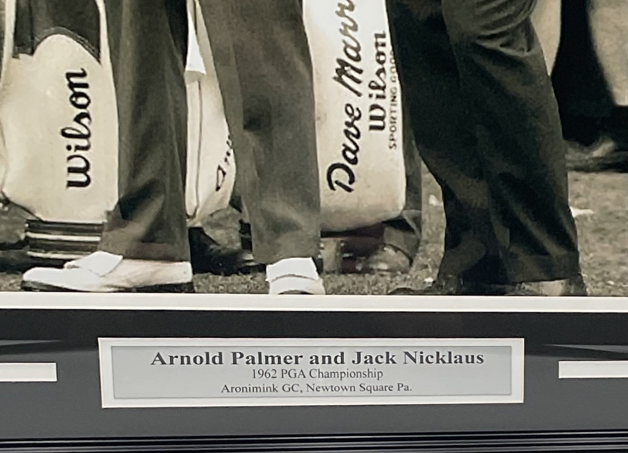 This photo shows two golf legends: Arnold Palmer and Jack Nicklaus. The 1962 PGA Championship was held at Aronimink Golf Club in Newtown Square, Pa. This photo is professionally matted and framed.