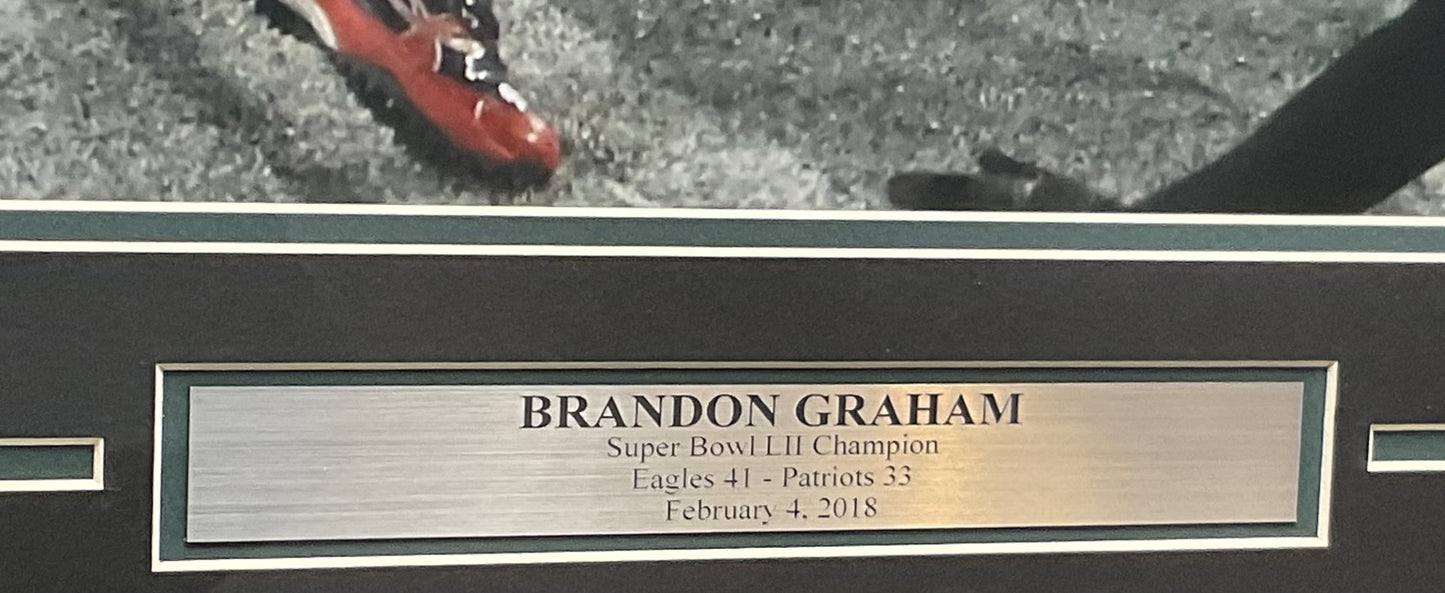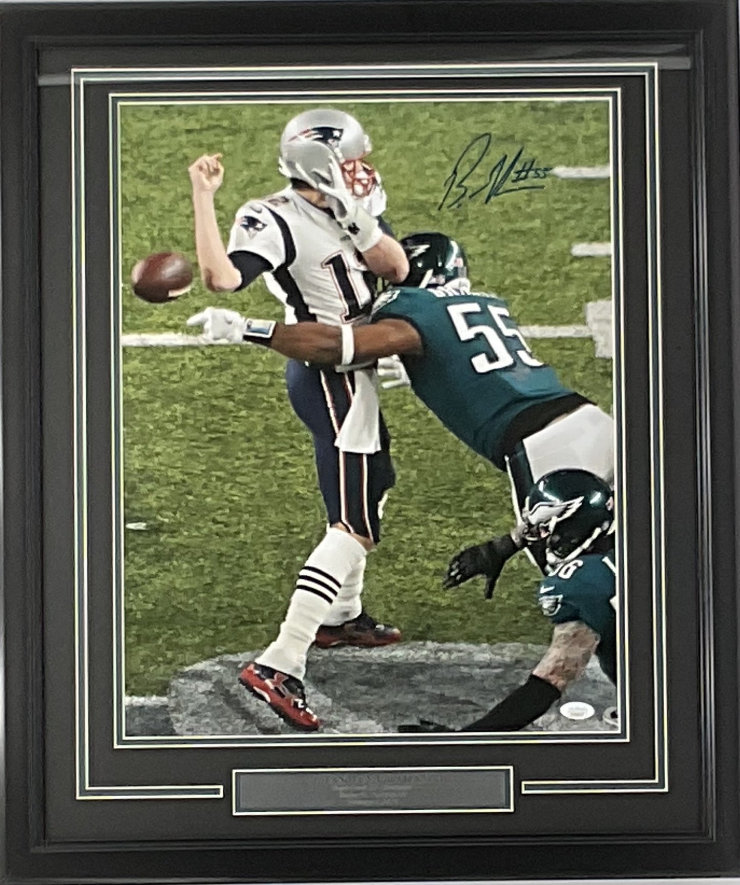 This 16x20 is personally autographed by Philadelphia Eagles SB LII Champion Brandon Graham. The strip sack of Tom Brady late in the 4th quarter led to a field goal and a 41-33 Super Bowl LII victory. This moment will live forever in Philadelphia Eagles history. Own it today. This photo is professionally matted and framed and comes with a JSA certificate of authenticity.