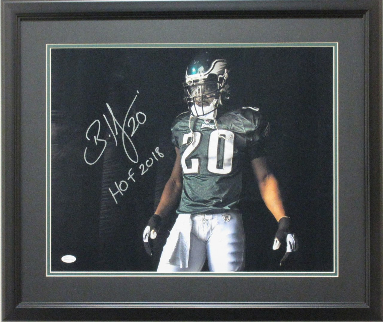 This 16x20 is personally autographed by Philadelphia Eagles Safety Brian Dawkins and inscribed HOF 2018". This photo is professionally matted and framed and comes with a JSA certificate of authenticity.