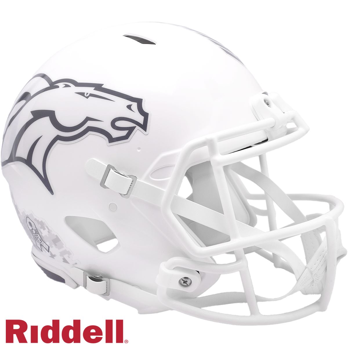 Riddell’s 2024 NFL Salute to Service helmets are inspired by those used by the military for decades, and are meant to honor the memory and selfless sacrifices of service members past and present. Each helmet features a gloss white shell and face mask. Decals and camouflage patterns match the official 2024 Salute to Service design elements and colorway. A chevron stripe pattern is used on every helmet, along with city name abbreviations on front bumpers, and Salute to Service back bumper decals. The camouflage wraparound decal includes the official Salute to Service ribbon and a full-color U.S. flag. Side decals are dark gray anthracite, one-color depictions of team logos.