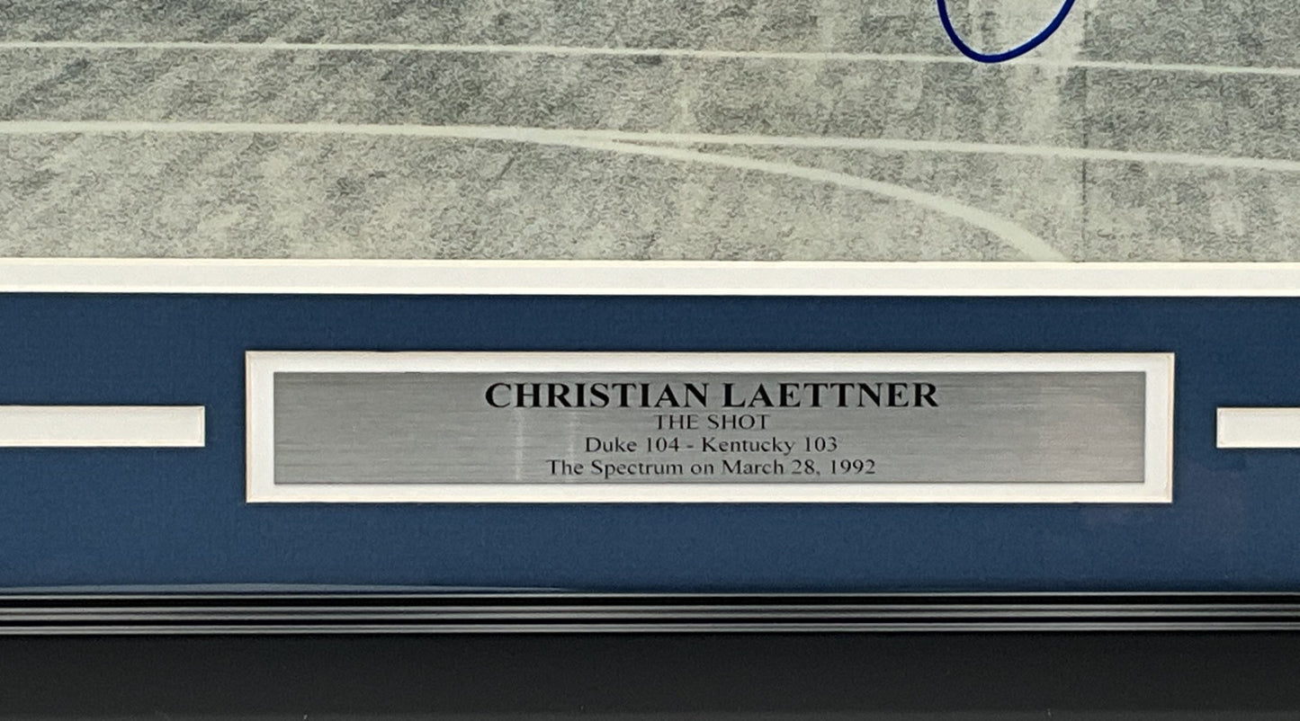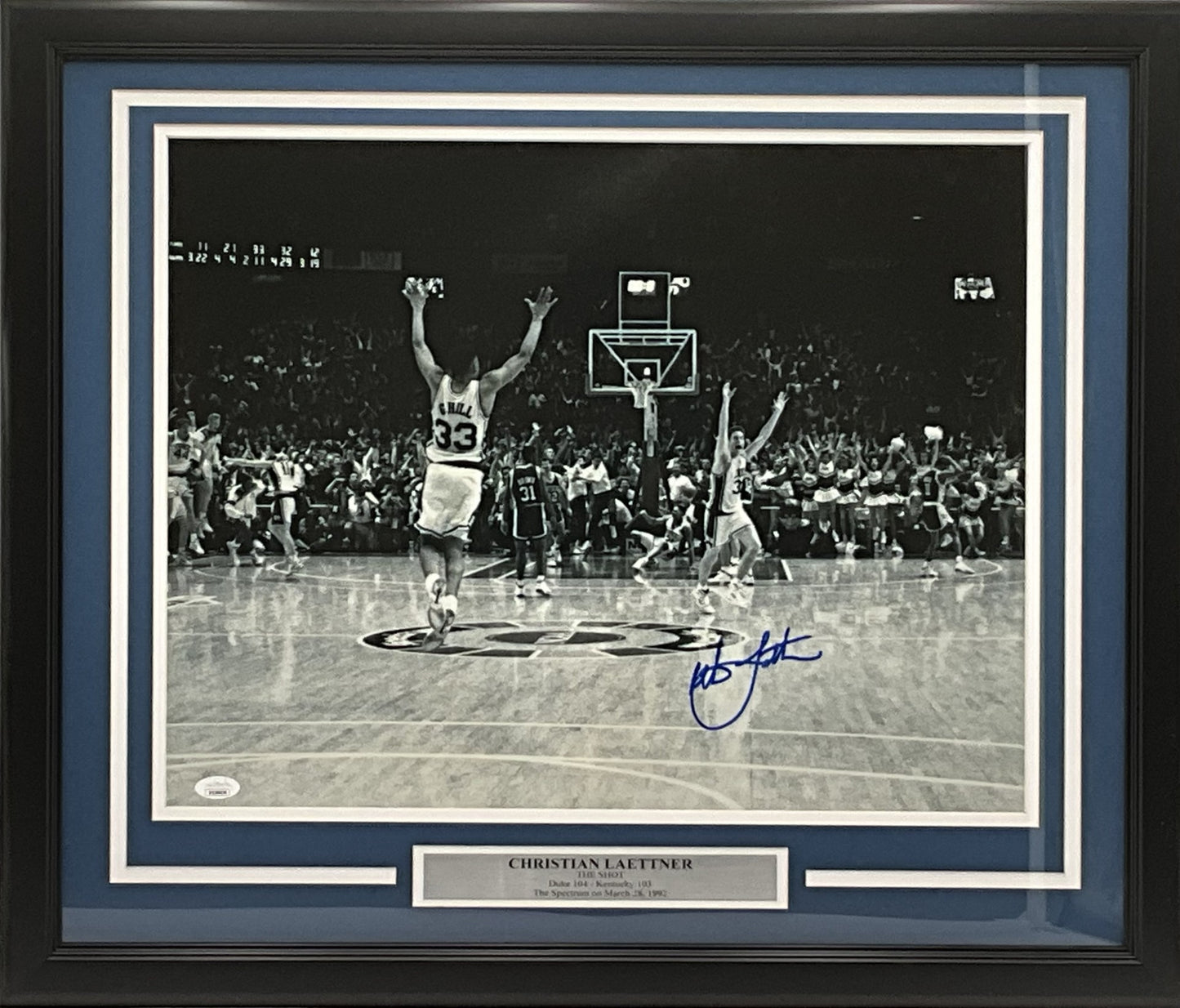 This 16x20 photo is personally autographed by former Duke Blue Devil Christian Laettner. Known simply as "The Shot", Laettner's turn-around jump shot beat the buzzer and the Kentucky Wildcats 104-103. The win put the Blue Devils in the final four where they would go on to beat Michigan 71-51 for the National Championship. This photo is professionally matted and framed and comes with a JSA certificate of authenticity.