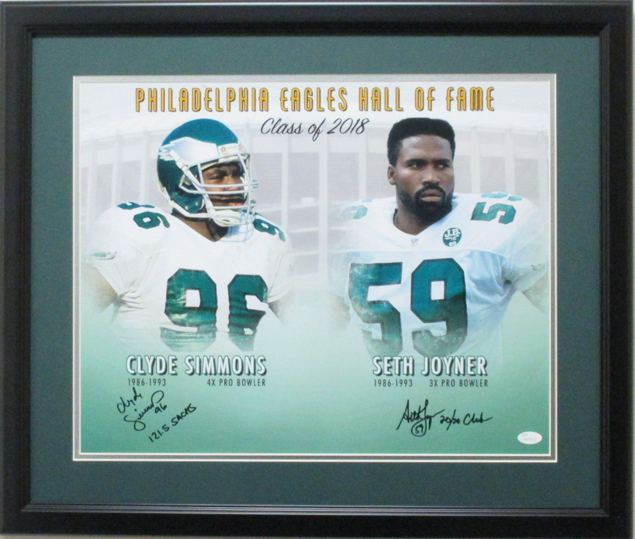 This 16x20 is personally autographed by both Clyde Simmons and Seth Joyner. These two defensive stars for the Eagles were elected to the Philadelphia Eagles Hall of Fame, Class of 2008. This 16x20 photo is professionally matted and framed and comes with a JSA certificate of authenticity.