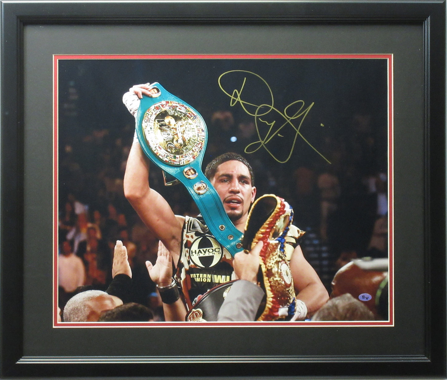 This 16x20 photo is personally autographed by former WBC Welterweight champion Danny Garcia. This photo shows Garcia holding his multiple Championship belts. This photo is professionally matted and framed and comes with a Sports Vault certificate of authenticity.
