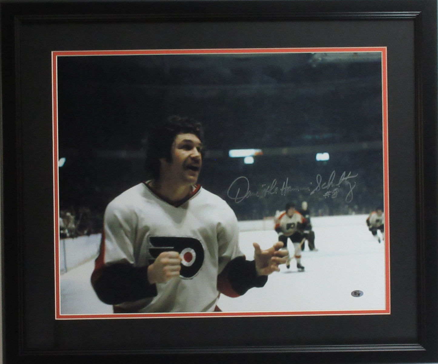This 16x20 photo is personally autographed by Philadelphia Flyers Dave Schultz. This photo is professionally matted and framed and comes with a Sports Vault certificate of authenticity.