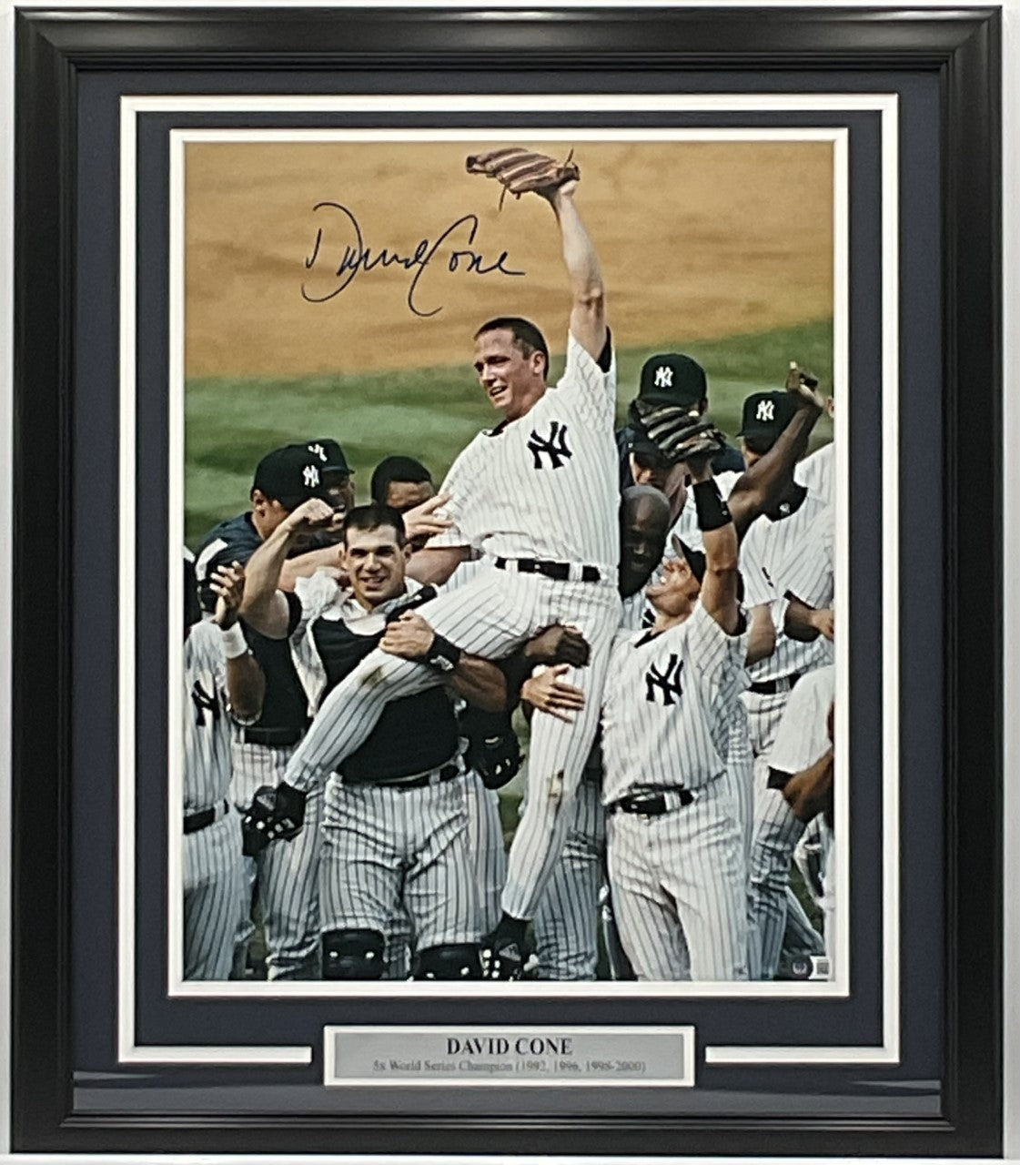 This 16x20 photo is personally autographed by former New York Yankee pitcher David Cone. This photo is professionally matted and framed and comes with a Beckett Hologram Authentication.