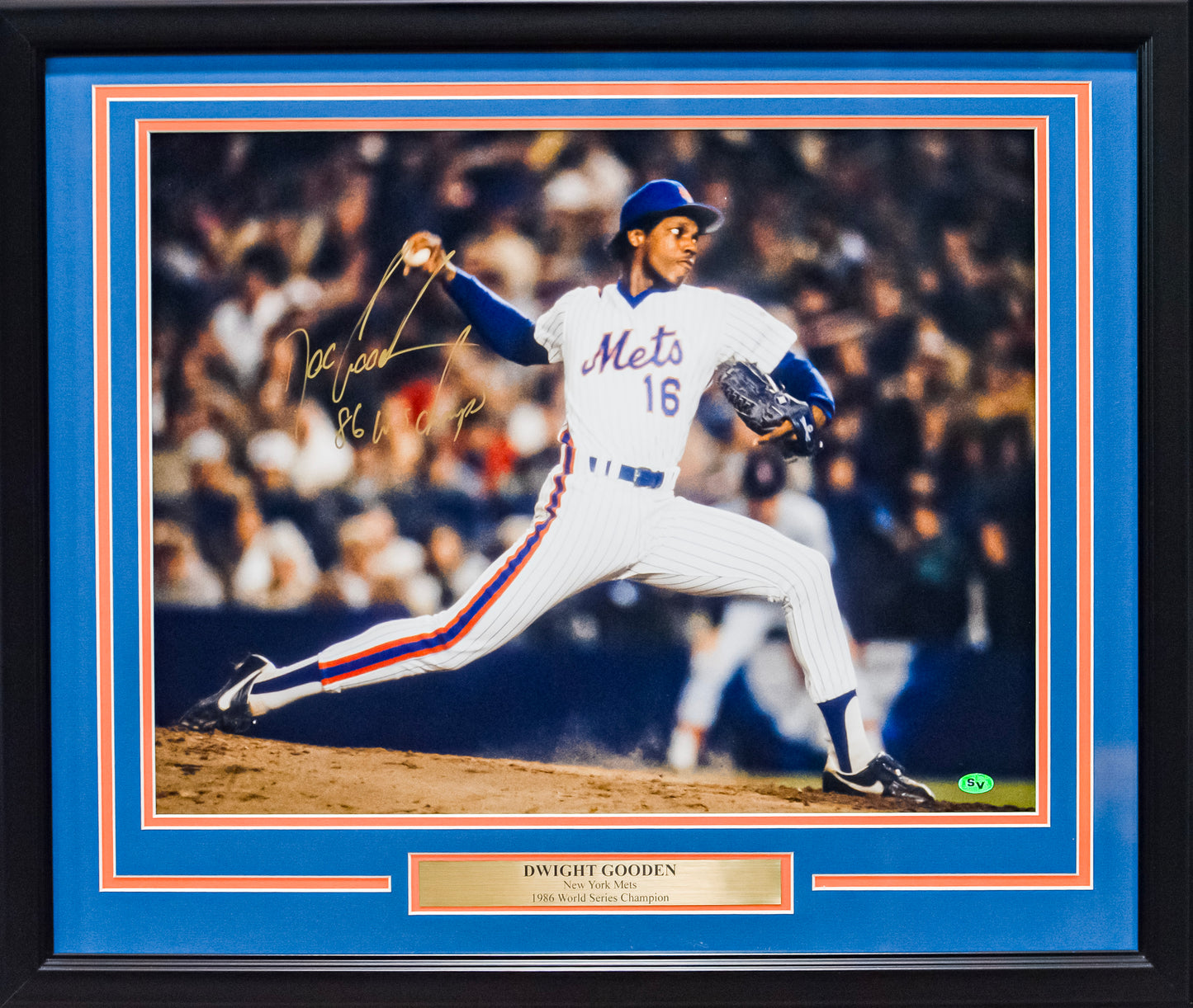 This photo is personally autographed by former New York Mets Pitcher, Dwight Gooden. Dwight was the ace of the 1986 Mets pitching staff that defeated the Boston Red Sox in 7 games to win the World Series. This photo is professionally matted and framed and comes with a Sports Vault certificate of authenticity.