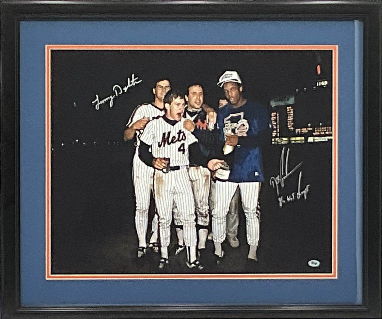 This 16x20 photo is personally autographed by two members of the 1986 New York Mets World Series Champions; Dwight Gooden and Lenny Dykstra. This photo is professionally matted and framed and comes with a Sports Vault Certificate of Authenticity.