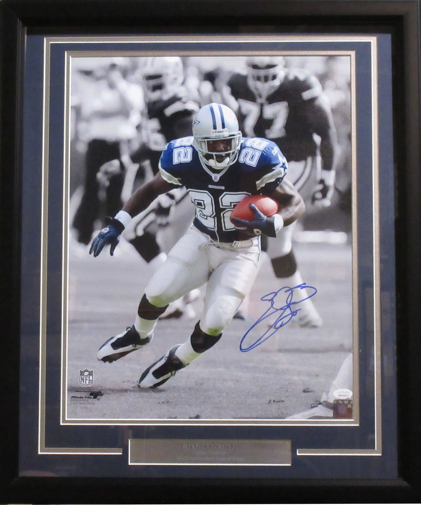 This 16x20 photo is personally autographed by Dallas Cowboy running back Emmitt Smith. Emmitt retired as the All-Time leading rusher in the history of the NFL. Smith was later elected to the Pro Football Hall of Fame Class of 2010. This photo is professionally matted and framed and comes with a JSA certificate of authenticity.