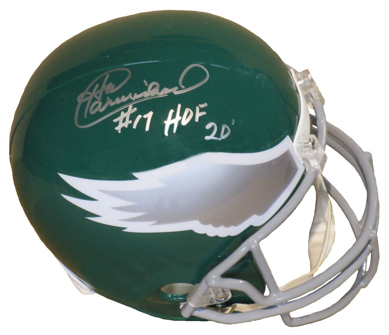 This full-size replica Philadelphia Eagles helmet is personally autographed by Harold Carmichael and inscribed "HOF 20". This replica helmet comes with a JSA certificate of authenticity.
