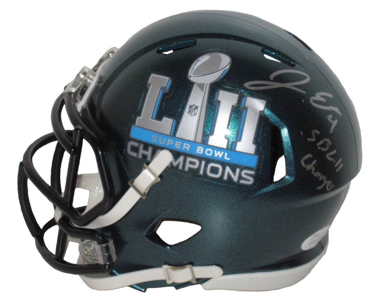This SB LII Philadelphia Eagles mini helmet is personally autographed by Jake Elliott and inscribed "SB LII Champs". This mini helmet comes with a JSA certificate of authenticity.