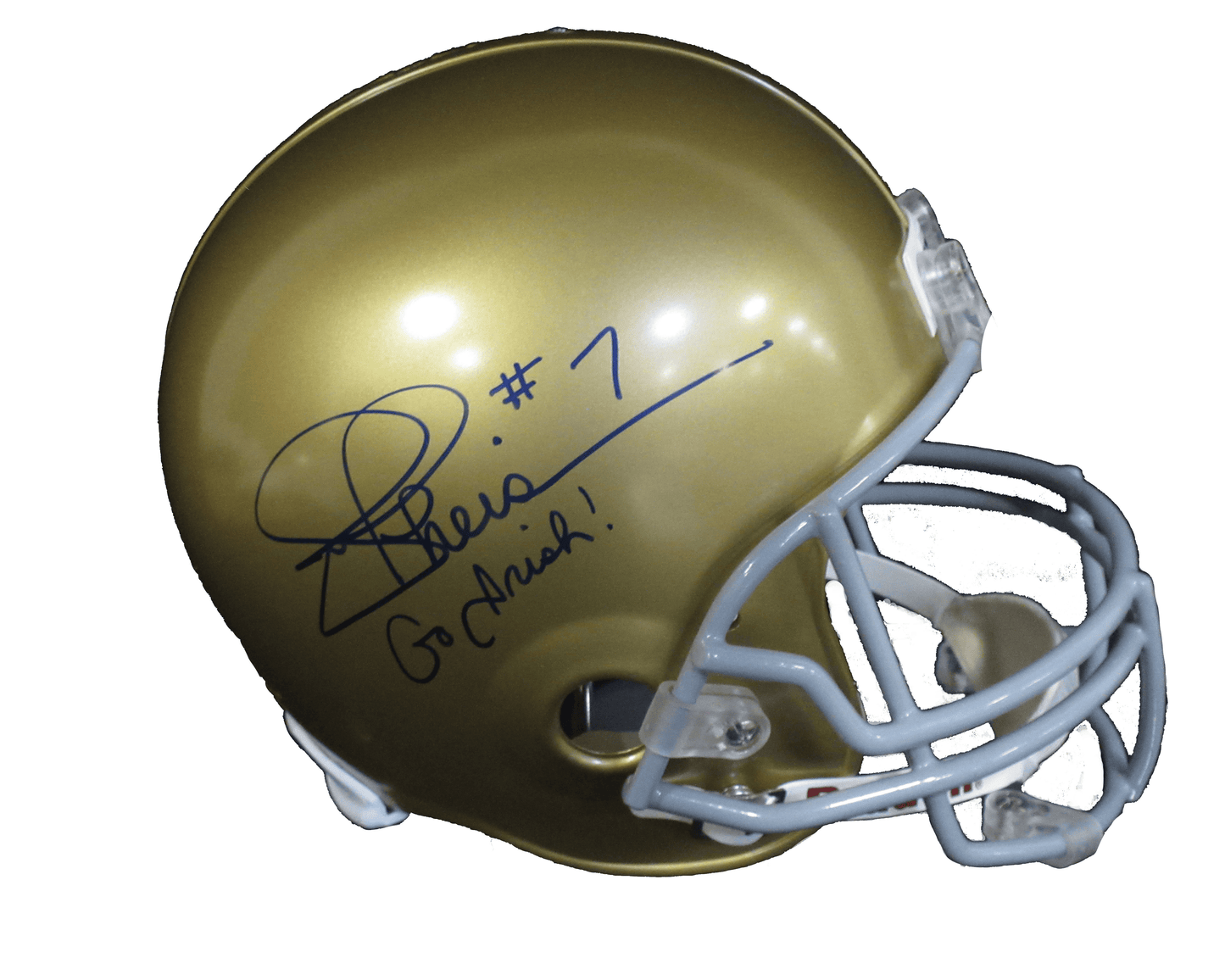 This Notre Dame replica helmet is personally autographed by Joe Theismann and Inscribed "Go Irish". This FS helmet comes with a Sports Vault certificate of authenticity.
