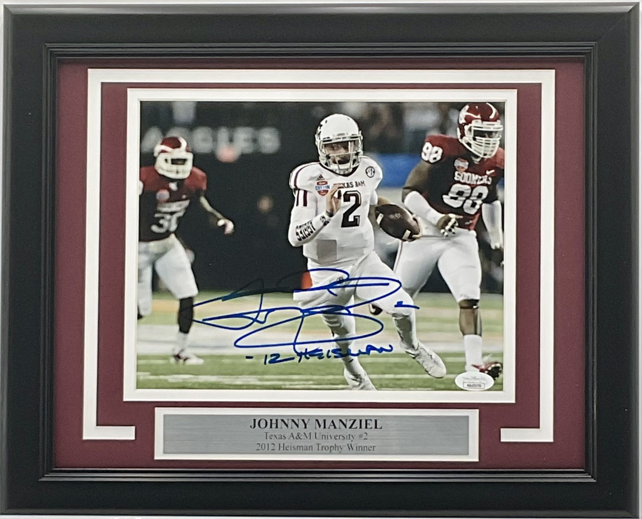 This 8x10 photo is personally autographed by former Texas A&M quarterback Johnny Manziel and inscribed "12 Heisman". This 8x10 photo is professionally matted and framed and comes with a JSA certificate of authenticity.
