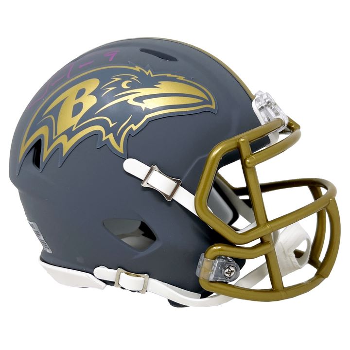 This Ravens Slate Mini Helmet has been hand signed by Justin Tucker - JSA Authentication