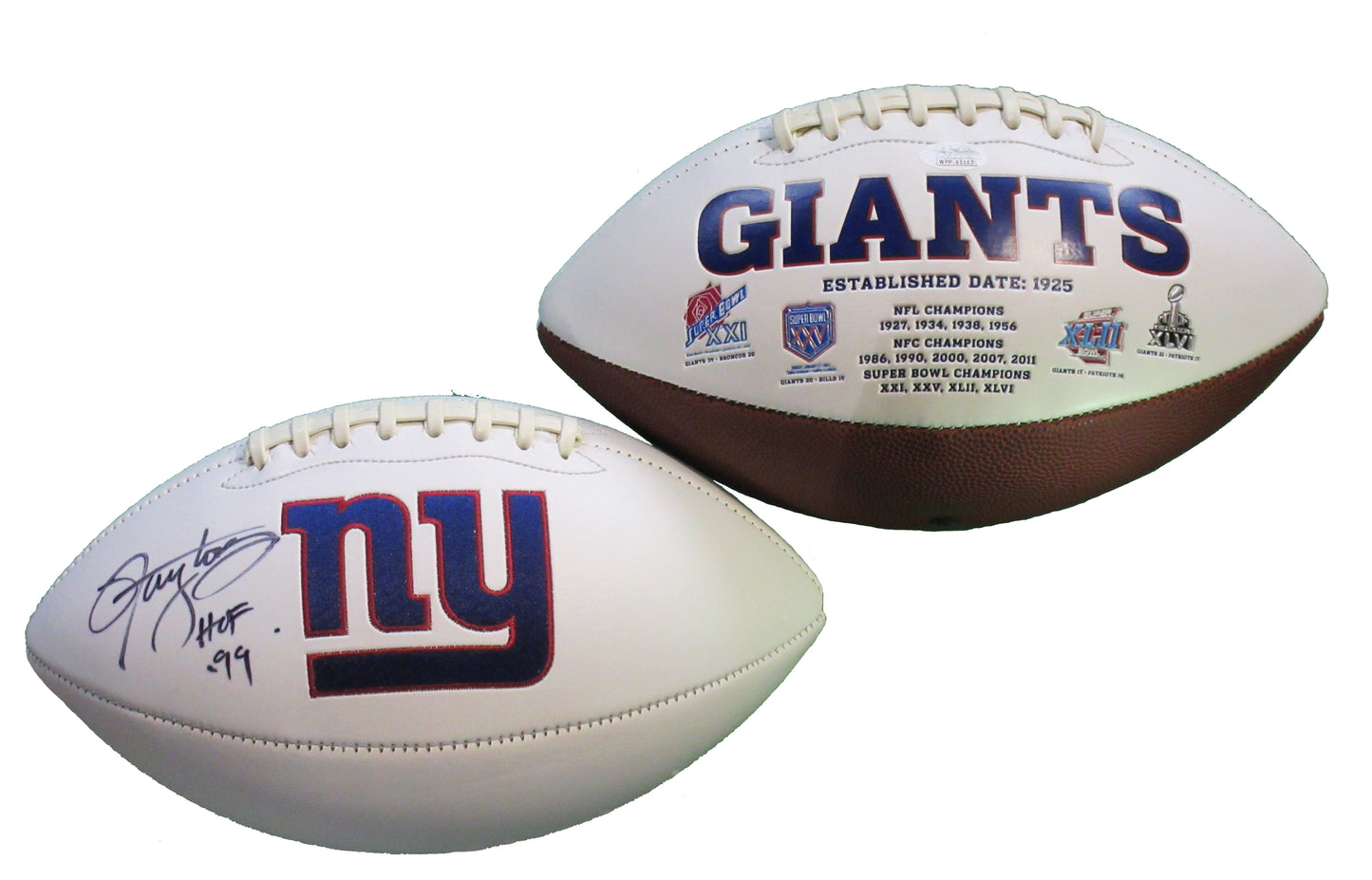 This New York Giants logo football is personally autographed by NFL Hall of Fame Linebacker Lawrence Taylor and inscribed "HOF 99". Taylor was the second pick in the 1981 NFL pick out of the University of North Carolina. Taylor, as a member of the New York Giants, was a 2x Super Bowl champion, a 10x Pro Bowler and elected to the NFL Hall of Fame in 1999. This New York Giants logo football comes with a JSA certificate of authenticity.