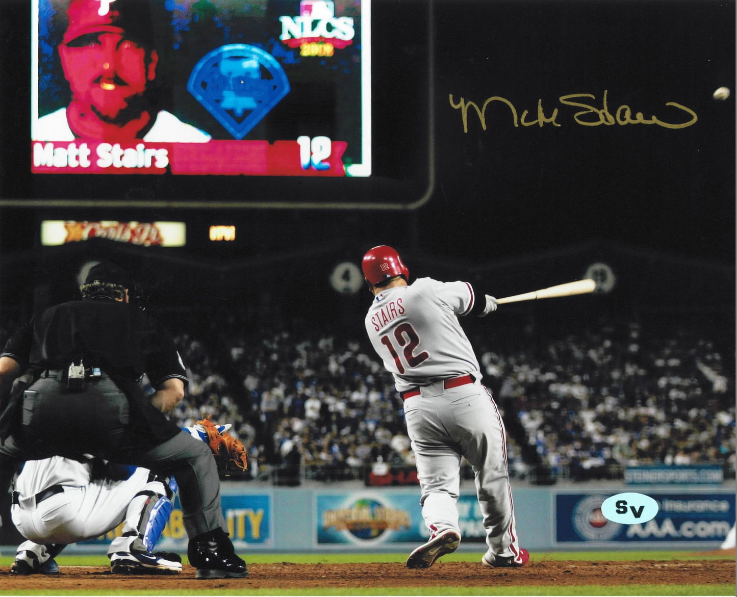 This 8x10 photo is personally autographed by former Philadelphia Phillies slugger Matt Stairs. This legendary home run by Matt Stairs against the Los Angeles Dodgers helped send the Phillies to the World Series. This photo is professionally matted and framed and comes with a Sports Vault certificate of authenticity.