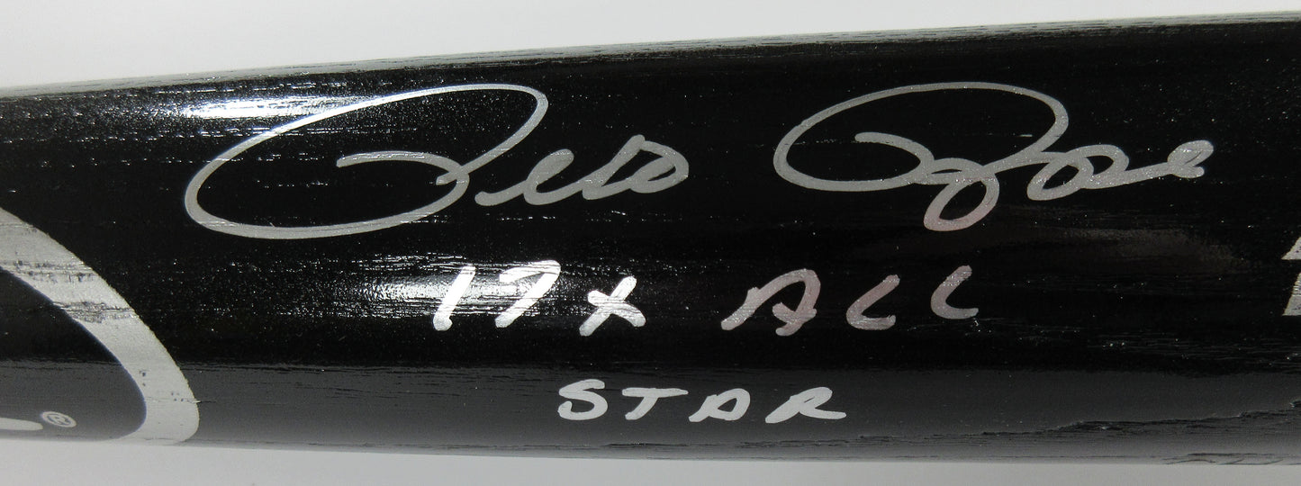 This engraved Rawlings baseball bat is personally autographed by Pete Rose and inscribed 17X All Star. Rose played most of his remarkable career with the Cincinnati Reds and the Philadelphia Phillies. Rose also ended his playing career with 4256 hits and 3 World Series championships. This bat comes with a Sports Vault certificate of authenticity.