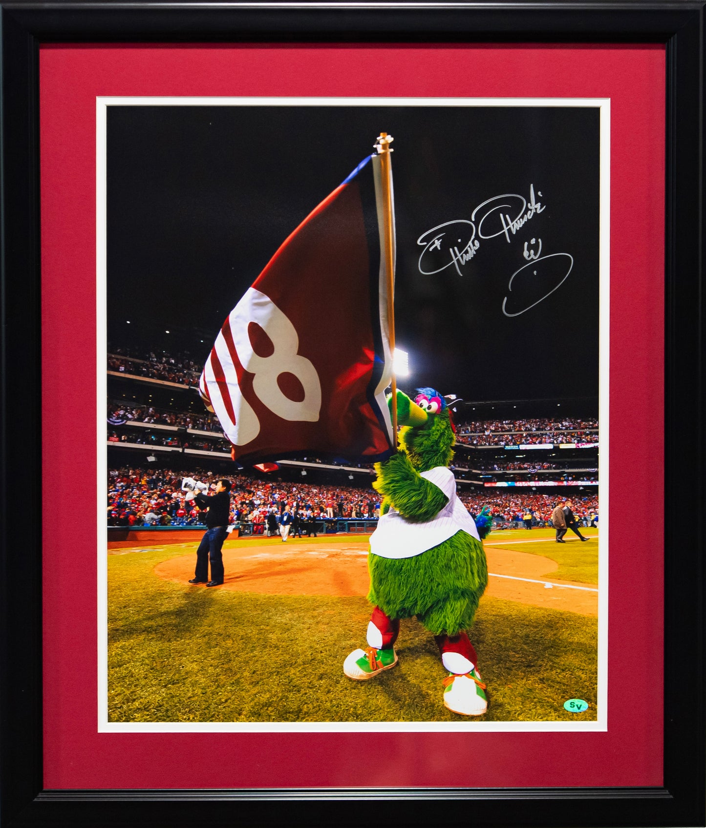 This 16x20 photo is personally autographed by the Philly Phanatic as he celebrates the 2008 World Series Championship. This photo is professionally matted and framed and comes with a Sports Vault certificate of authenticity.