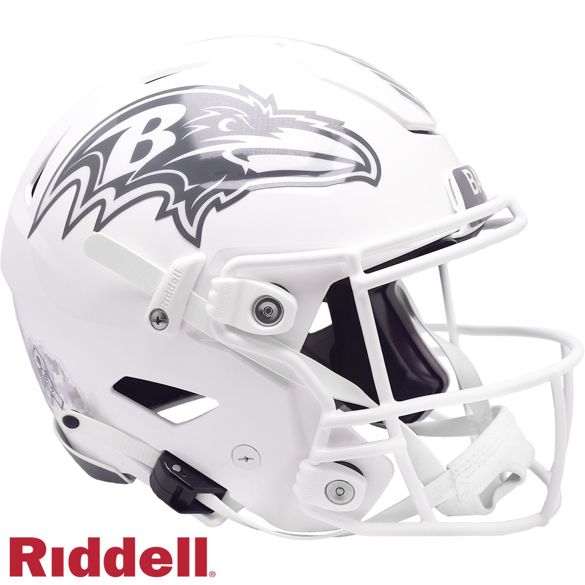 Riddell’s 2024 NFL Salute to Service helmets are inspired by those used by the military for decades, and are meant to honor the memory and selfless sacrifices of service members past and present. Each helmet features a gloss white shell and face mask. Decals and camouflage patterns match the official 2024 Salute to Service design elements and colorway. A chevron stripe pattern is used on every helmet, along with city name abbreviations on front bumpers, and Salute to Service back bumper decals. The camouflage wraparound decal includes the official Salute to Service ribbon and a full-color U.S. flag. Side decals are dark gray anthracite, one-color depictions of team logos.