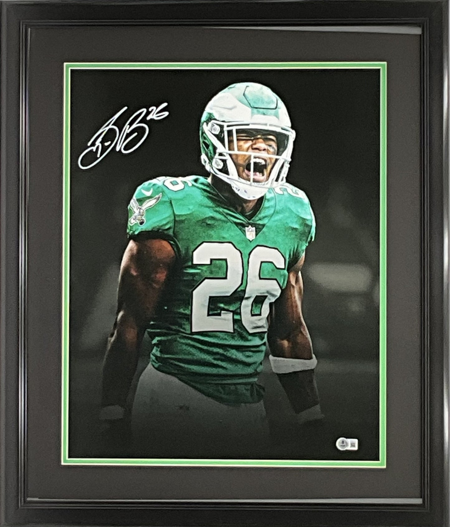 This 16x20 photo is personally autographed by Philadelphia Eagles running back Saquon Barkley. This photo is professionally matted and framed and comes with a Beckett certificate of authenticity.