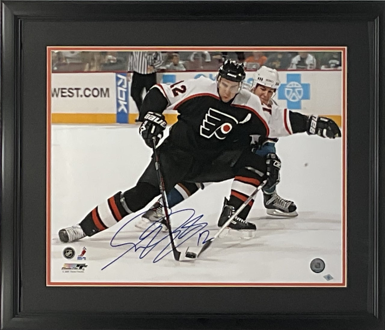 This 16x20 photo is personally autographed by former Philadelphia Flyer Simon Gagne. This photo is professionally matted and framed and comes with a Sports Vault certificate of authenticity.