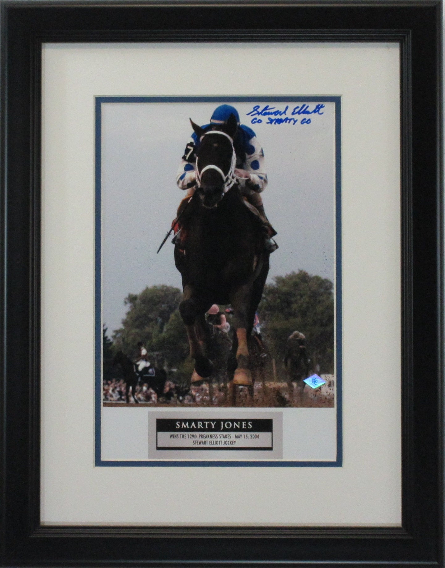 This 8x10 photo is personally autographed by Preakness Stakes winning jockey Stewart Elliott and inscribed "Go Smarty Go". On May 15th, 2004, Smarty Jones won the 129th running of the Preakness Stakes in Baltimore Maryland. This photo is professionally matted and framed and comes with a BC Sports certificate of authenticity.