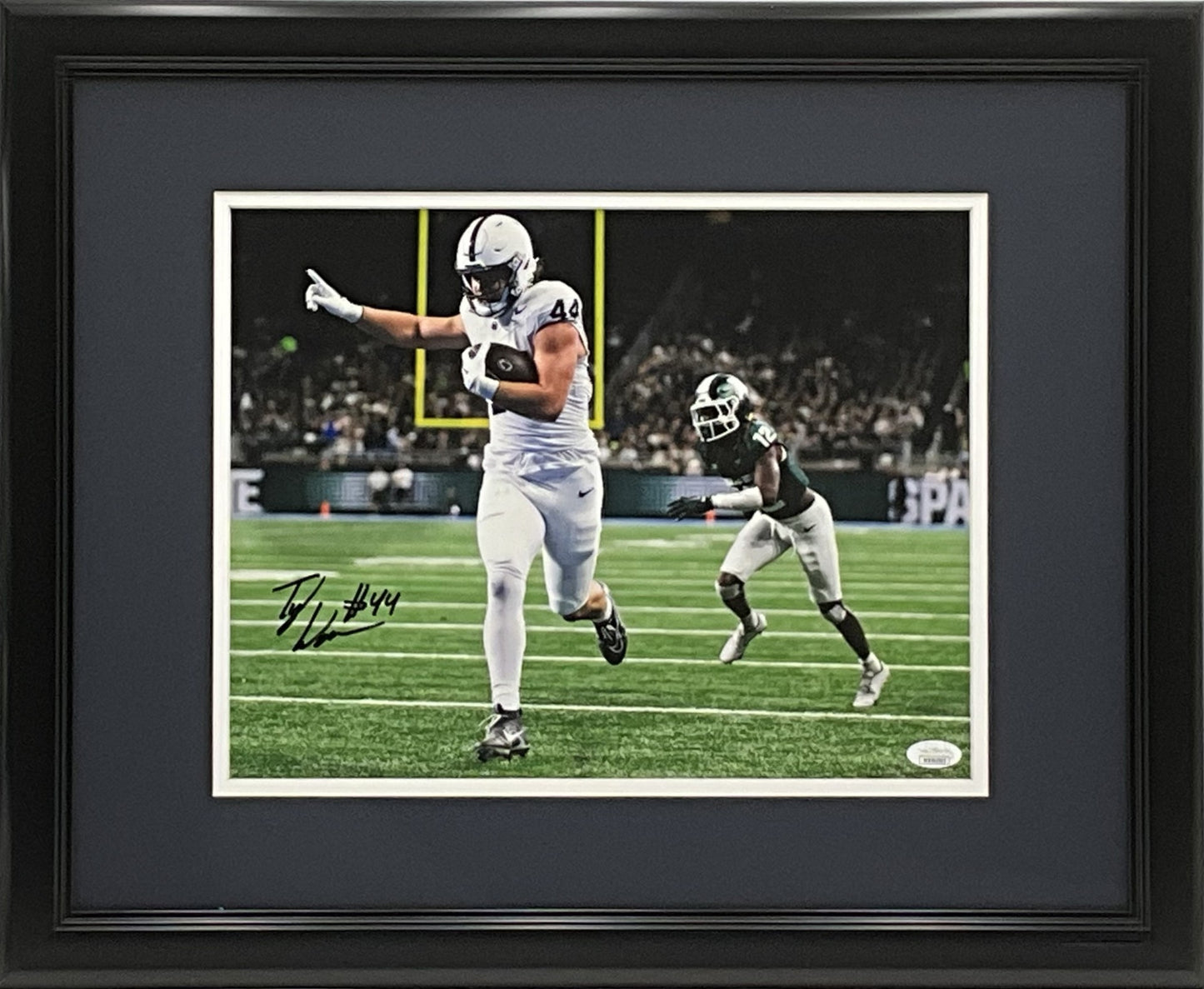 This 11x14 photo is personally autographed by Penn State Tight End Ty Warren. Warren has been a jack of all trades for the Nittany Lions, running, passing and catching the football. This photo is professionally matted and framed comes with a JSA certificate of authenticity.